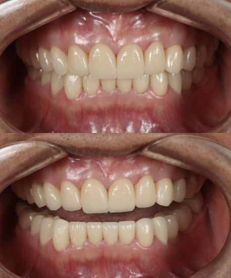 The final result shows balanced gingival levels, improved tooth proportions, stable bite function, and a confident, healthy smile.